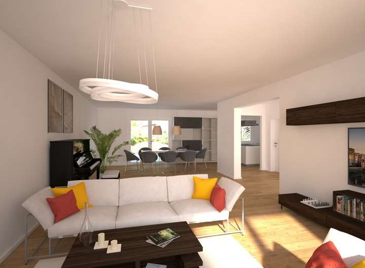 •Großzügiges Wohn- und Esszimmer mit offener Küche – ein beeindruckender Lebensmittelpunkt mit Blick und Zugang in den Garten