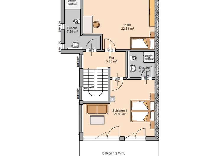 Das Obergeschoss beherbergt ein großzügiges Elternschlafzimmer mit eigenem Duschbad sowie ein großes Kinderzimmer mit separater Dusche. Das Highlight auf dieser Etage ist der große Balkon, der aus dem Sclafzimmer zugängig ist.