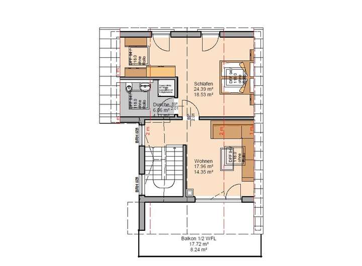 Im Dachgeschoss befinden sich zwei weitere Räume zur individuellen Nutzung. Ein zusätzliches Duschbad im komplettiert das Raumprogramm unter dem Dach.