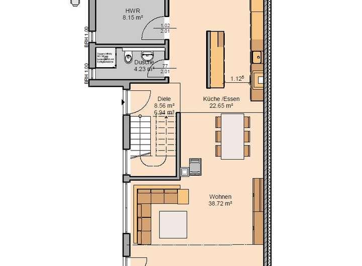 Im Erdgeschoss befinden sich neben Küche und Wohn-Esszimmer auch ein Duschbad und der Hauswirtschaftsraum.