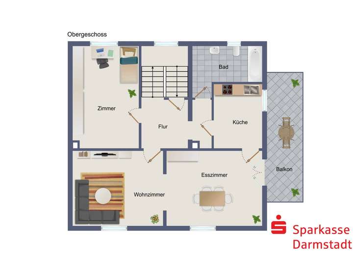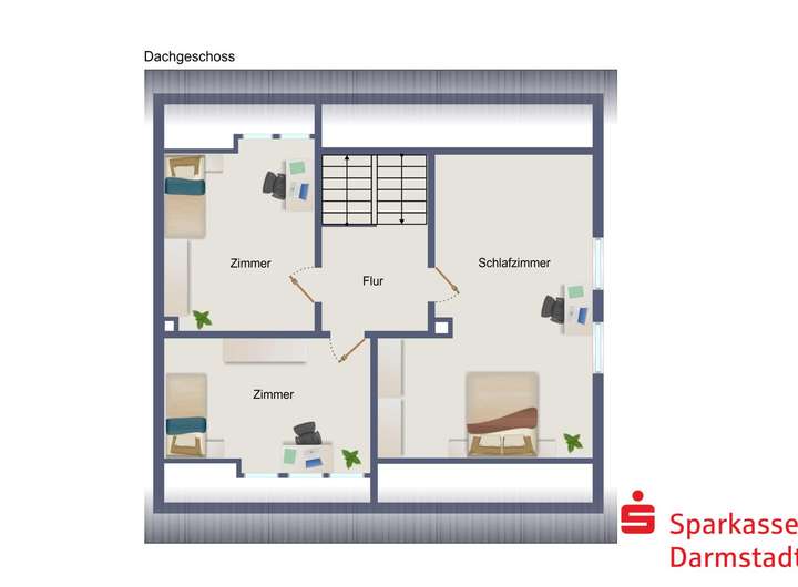 Eine zweite Wohneinheit ist als Maisonettewohnung im Ober- und Dachgeschoss ausgebildet. Das Obergeschoss beherbergt eine Diele, eine Zimmer, eine Küche, ein Tageslichtwannenbad mit WC sowie einen großzügigen Wohn- und Essbereich. Von dort erreicht man einen nach Nordwesten gelegenen Balkon. Im Dachgeschoss finden sich ein Flur und drei weitere Zimmer.