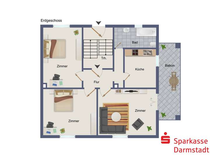 Im Erdgeschoss ist eine 3-Zimmerwohnung mit Flur, Küche und Tageslichtwannenbad mit WC angeordnet. Der Wohnbereich bietet Zugang auf einen nach Nordwesten ausgerichteten Balkon.