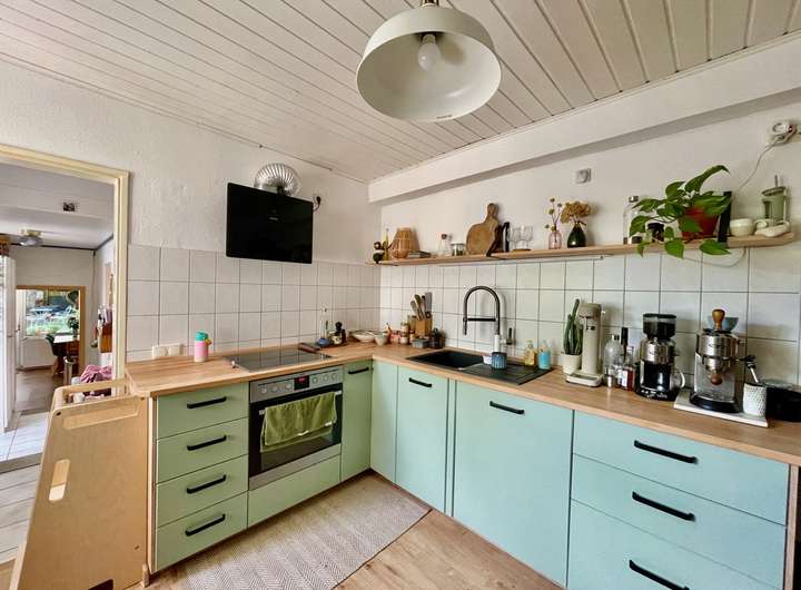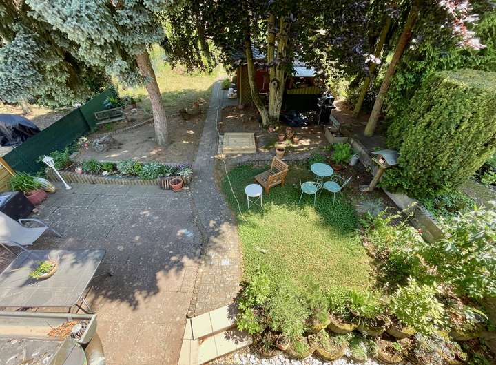 Auf einer Wohnfläche von insgesamt 192 qm auf zwei Wohnetagen teilen sich zwei vollständig vermietete Wohneinheiten mit je einem eigenem Eingang sowie einem großen sonnenverwöhnten Gemüsegarten, welcher hälftig auf beide Parteien aufgeteilt ist. Dieser herrliche Garten mit seinem Gartenhaus, machen diesen Ort zu einer Oase der Ruhe und Stille.