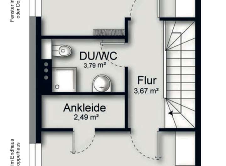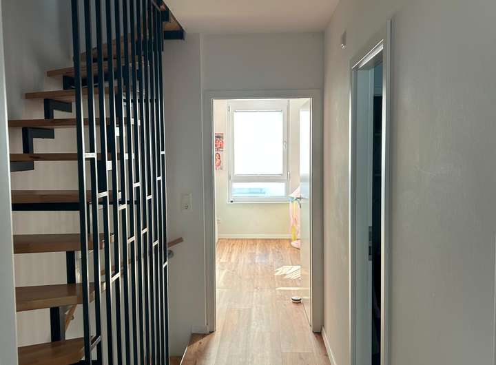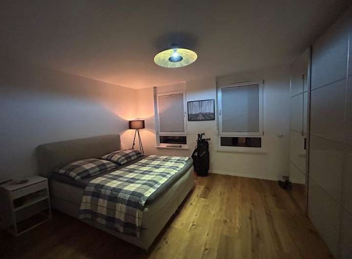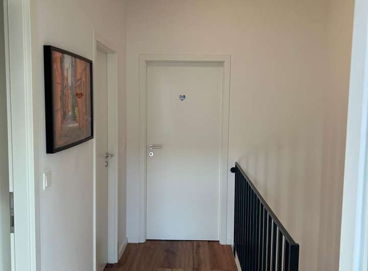 Im Obergeschoss befinden sich das großzügige Hauptschlafzimmer, ein weiteres Zimmer, das sich ideal als Kinder-, Arbeits- oder Gästezimmer eignet, sowie ein modernes Badezimmer mit hochwertigen Sanitärobjekten.