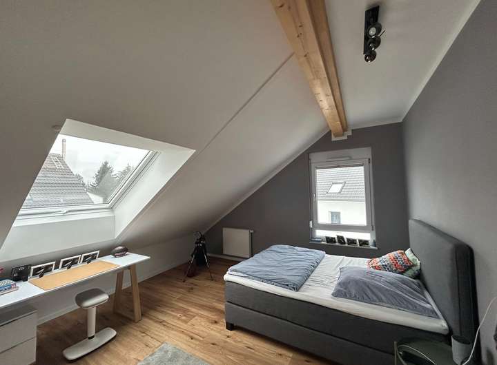 Das voll ausgebaute Dachgeschoss bietet zwei weitere Schlafzimmer sowie ein zusätzliches Badezimmer. Damit eignet sich dieser Bereich perfekt für Jugendzimmer, Gäste oder als Rückzugsort für die Familie. Eine praktische Abstellkammer sorgt für zusätzlichen Stauraum.