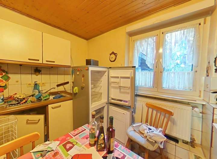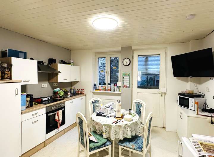 Über einen Zugangsflur betreten Sie das UG des Hauses, in welchem sich neben einem Abstellraum noch ein kleiner Terrassenbereich sowie diverse Kellerräume befinden. Die massive und neu geflieste Treppe führt Sie ins eigentliche EG. Hier befindet sich eine Wohneinheit, bestehend aus einer großen und hellen Küche mit Ausgang auf eine rückwärtige Terrasse, ein Wohn-/Esszimmer, ein großes Tageslichtbadezimmer, ein Schlafzimmer, ein Gäste-WC sowie der Flur-/Dielenbereich.