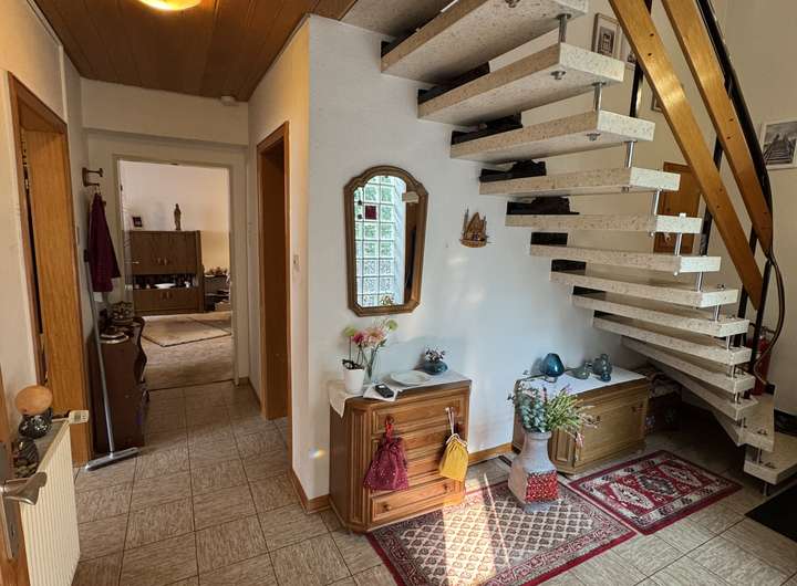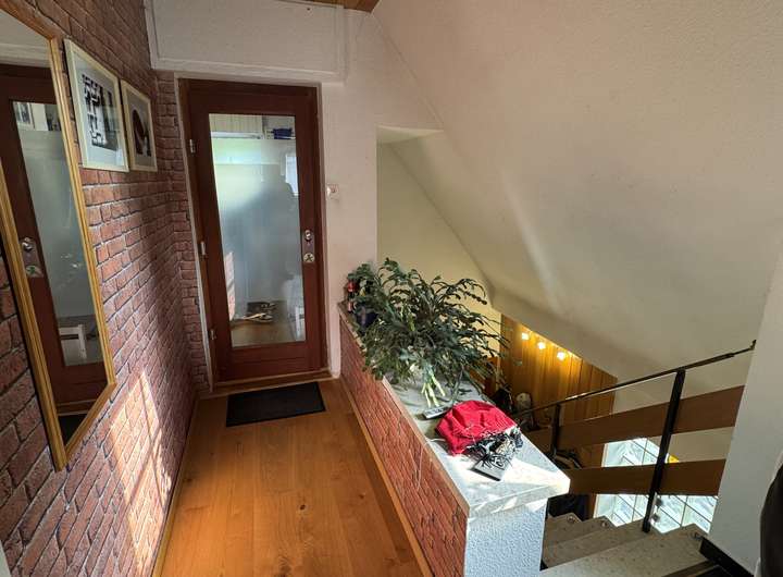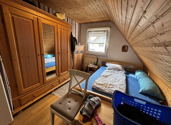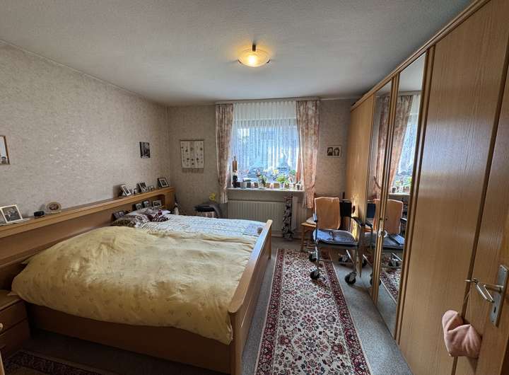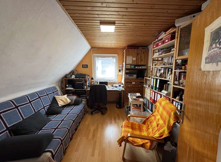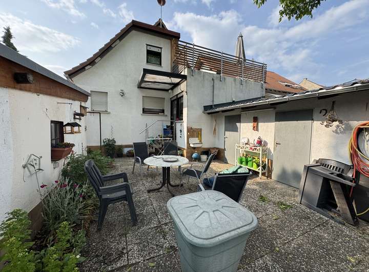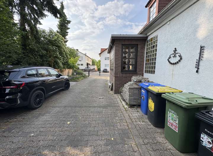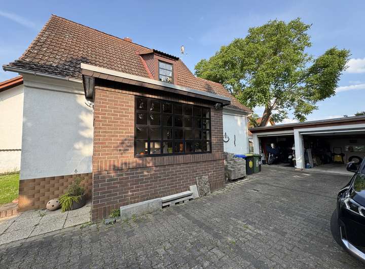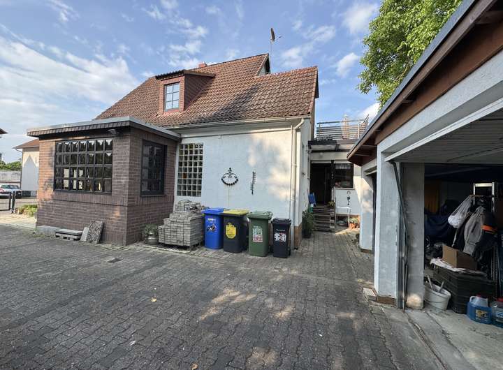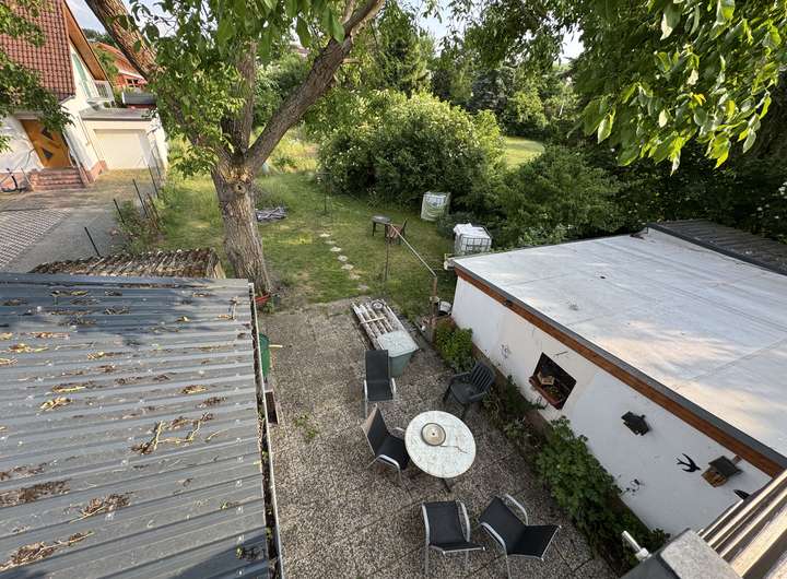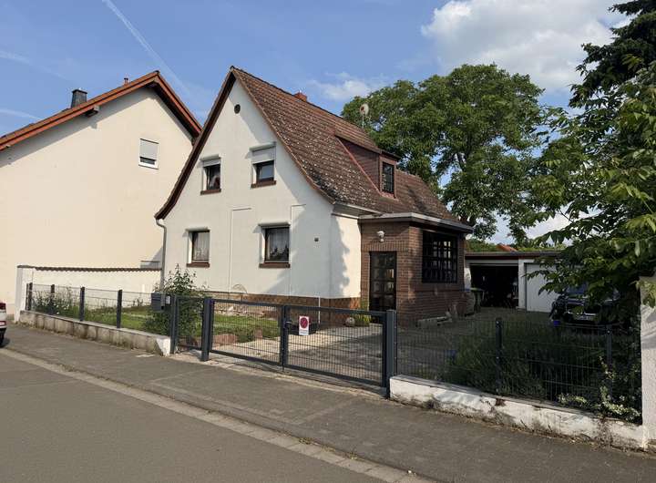 Das freistehende Einfamilienhaus aus dem Jahr 1955 befindet sich in einer guten Lage und ist in ein schönes Wohnumfeld eingebettet. Das großzügige Grundstück von 1159 m² bietet viel Raum für individuelle Gestaltungsmöglichkeiten. Im Erdgeschoss stehen etwa 92 m² Wohnfläche mit einem Schlafzimmer, großem Wohn- und Esszimmer, Küche, Bad und Gäste-WC zur Verfügung. Das Dachgeschoss mit ebenfalls 2 Zimmern, Küche, Bad und einer großen Dachterrasse bietet ca. 54 m² Wohnfläche und viel Platz für kreative Nutzung. Das Haus ist voll unterkellert, was zusätzlichen Stauraum schafft. Im Hof gibt es zwei Garagen sowie bis zu vier Stellplätze, was für ausreichend Parkmöglichkeiten sorgt. Außerdem eröffnet die Größe des Grundstücks die Möglichkeit, im hinteren Bereich mit einer Zufahrt an den Garagen vorbei ein großes, freistehendes Haus zu bauen – ideal für Familien oder Investoren, die noch mehr Raum schaffen möchten.