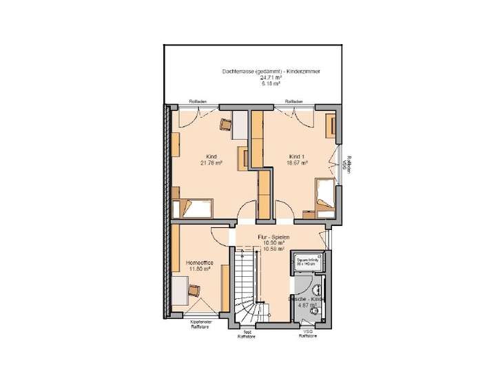 Das Obergeschoss beherbergt zwei Kinderzimmer mit Zugang zur Dachterrasse, ein zusätzliches Homeoffice und ein Duschbad.