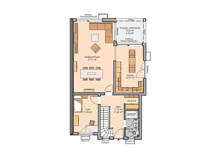 Im Erdgeschoss befindet sich angrenzend an den geräumigen Wohn- und Essbereich eine Küche mit großen Fensterflächen, die für Helligkeit sorgen und einen direkten Zugang zur überdachten Terrasse ermöglichen. Ein Zimmer für den Gast sowie das gegenüberliegende Duschbad bieten zusätzlichen Komfort.