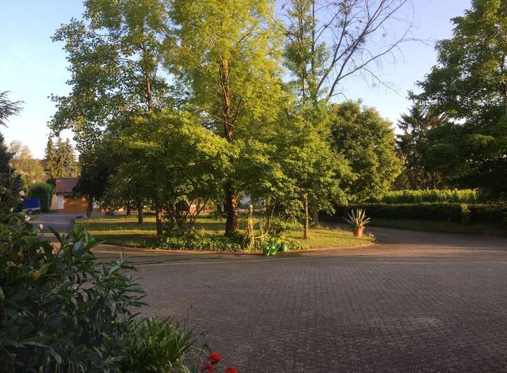 Zwei großflächige Terrassen (90 Quadratmeter und 60 Quadratmeter) bieten nicht nur eine großartige Aussicht in die Natur, sondern auch den Blick auf die eigene rondellartige Grundstückseinfahrt, welche mit schönem altem Baumbestand die direkte Einsicht von der Straße schützt.