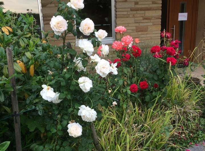 Rampe vom Straßenniveau bis Bungalowniveau für Nutzung mit Rollfahrzeugen. Großzügige Parkmöglichkeiten auf dem Grundstück.