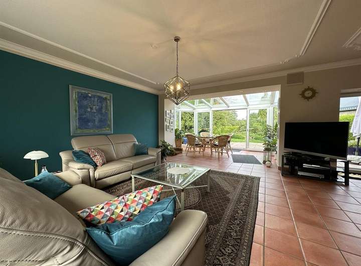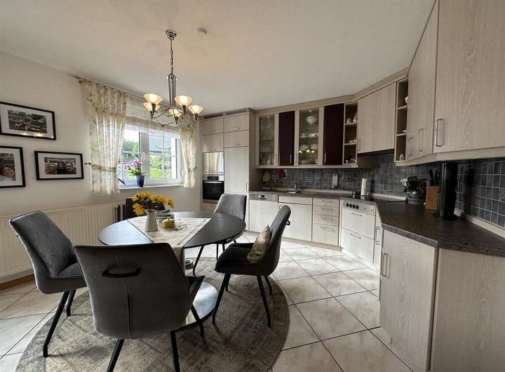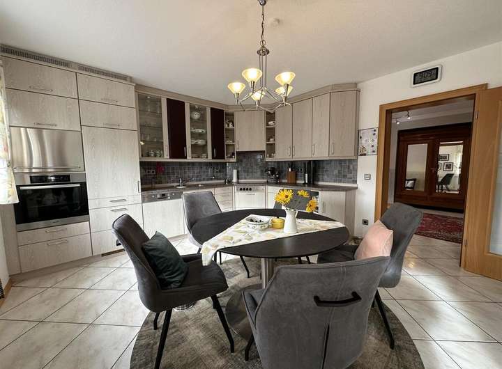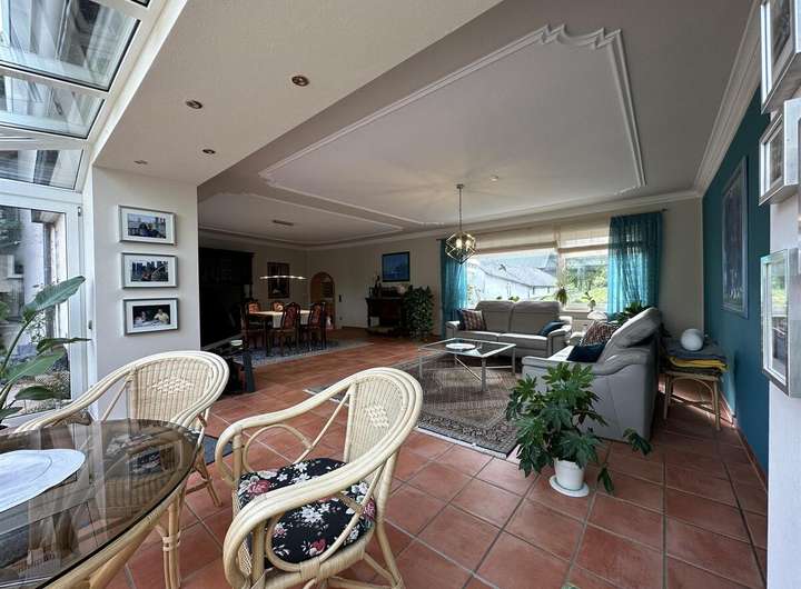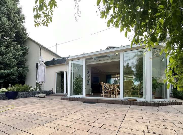 Im Erdgeschoss befindet sich die Küche, das sanierte Badezimmer, ein Büro und ein großer Wohn- und Essbereich mit angrenzendem Wintergarten.