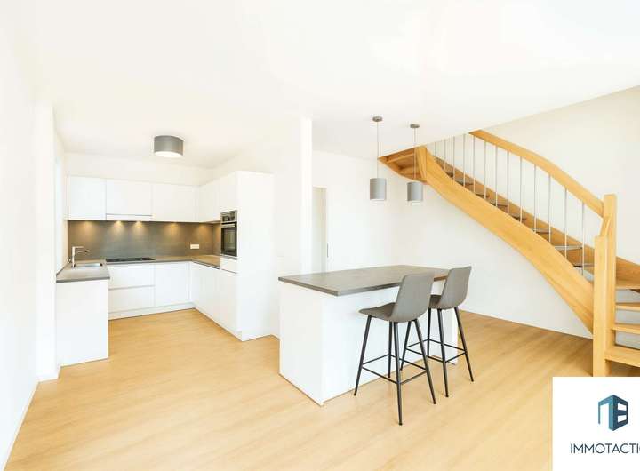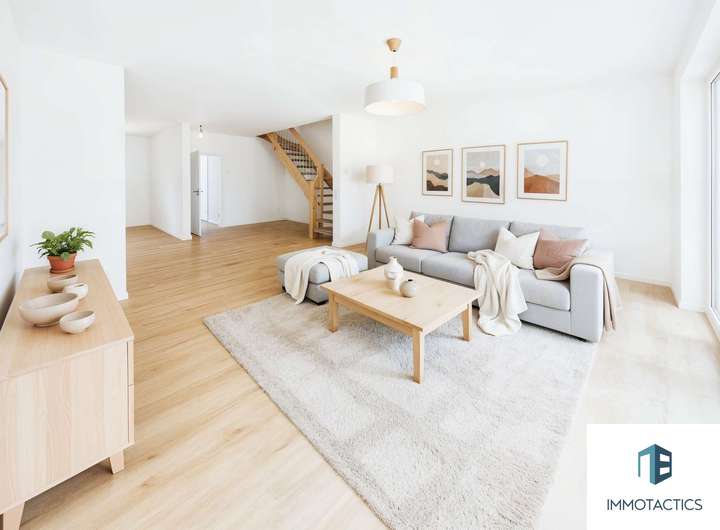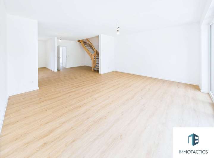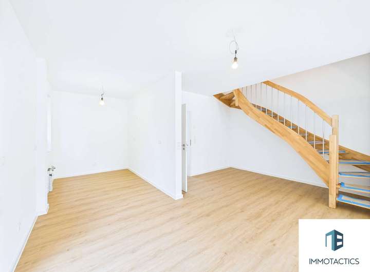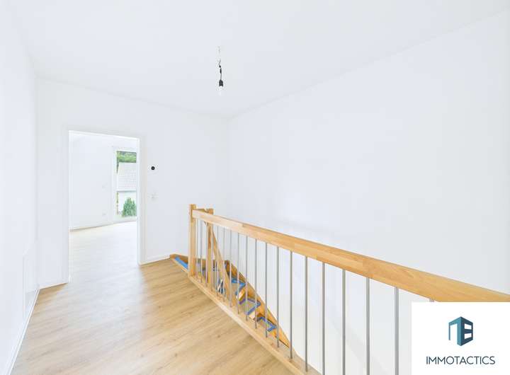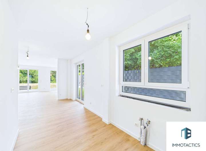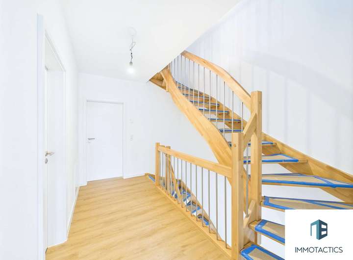 Im Erdgeschoss empfängt Sie ein separater Eingangsbereich, von dem aus das moderne Gäste-WC und der Hauswirtschaftsraum mit Anschlüssen für Technik, Waschmaschine und Trockner zugänglich sind. Der offene Wohn-, Ess- und Küchenbereich bildet das Herzstück des Hauses. Bodentiefe Fensterfronten lassen viel Tageslicht herein und bieten einen weiten Blick in den Garten und auf die Terrasse. Eine stilvolle Massivholztreppe verbindet alle Etagen miteinander und unterstreicht die wertige Gestaltung des Hauses.