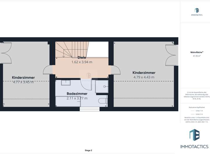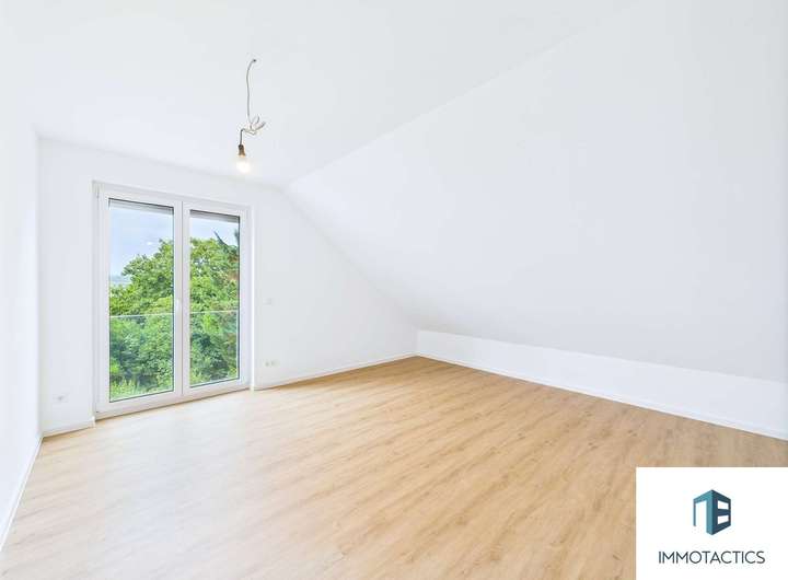 Das Dachgeschoss verfügt über zwei helle, nahezu gleich große Zimmer, die sich ideal als Kinderzimmer eignen. Ergänzt wird der Bereich durch ein eigenes Badezimmer mit Fenster, Dusche und Badewanne – baugleich zum Bad im 1. Obergeschoss. Die Etage ist klar vom restlichen Wohnbereich getrennt und schafft damit eine praktische Raumaufteilung für Kinder oder Gäste.