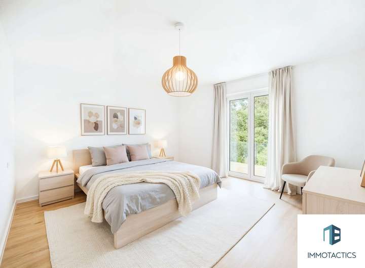 Im ersten Obergeschoss erwartet Sie ein Elternschlafzimmer mit angrenzender Ankleide. Bodentiefe Fenster sorgen hier für eine helle und freundliche Atmosphäre. Ein weiteres Zimmer eignet sich ideal als Büro. Auch dieser Raum ist mit zwei bodentiefen Fenstern ausgestattet und bietet einen ruhigen, ungestörten Platz für konzentriertes Arbeiten im Homeoffice. Das Tageslichtbad ist mit einer bodentiefen Dusche und einer separaten Badewanne ausgestattet.