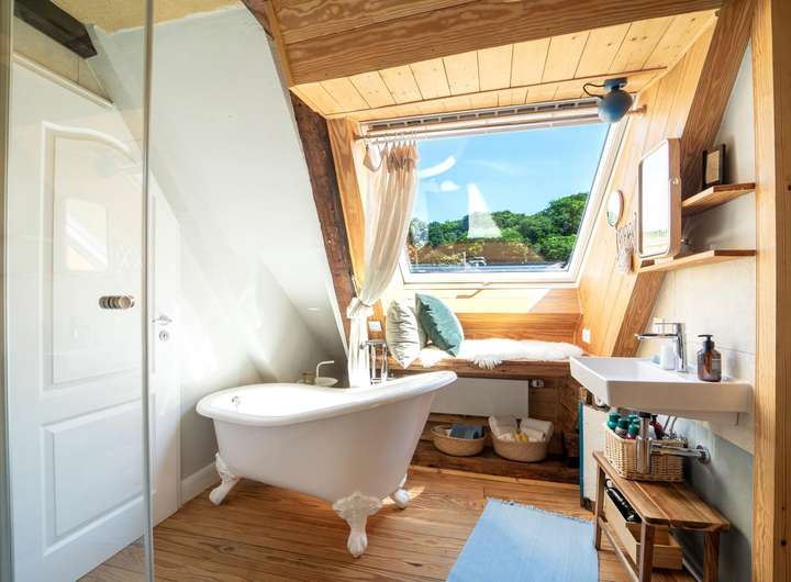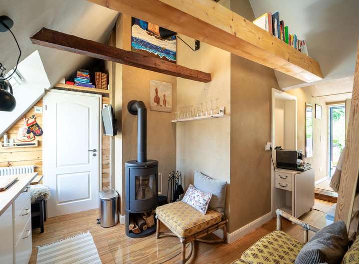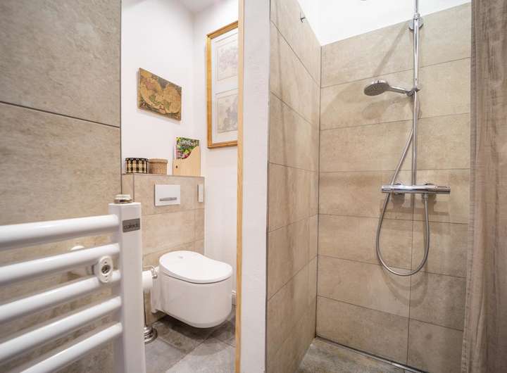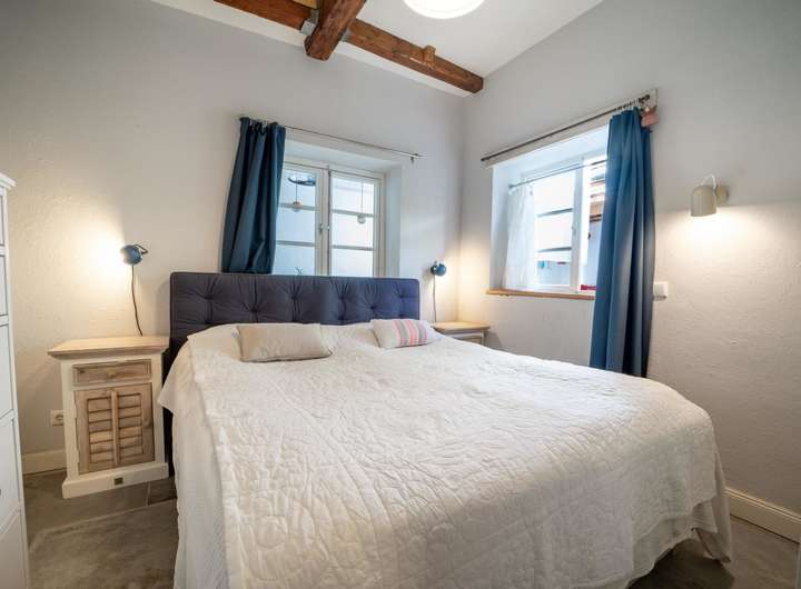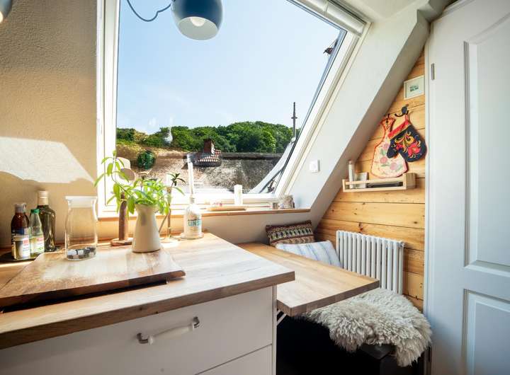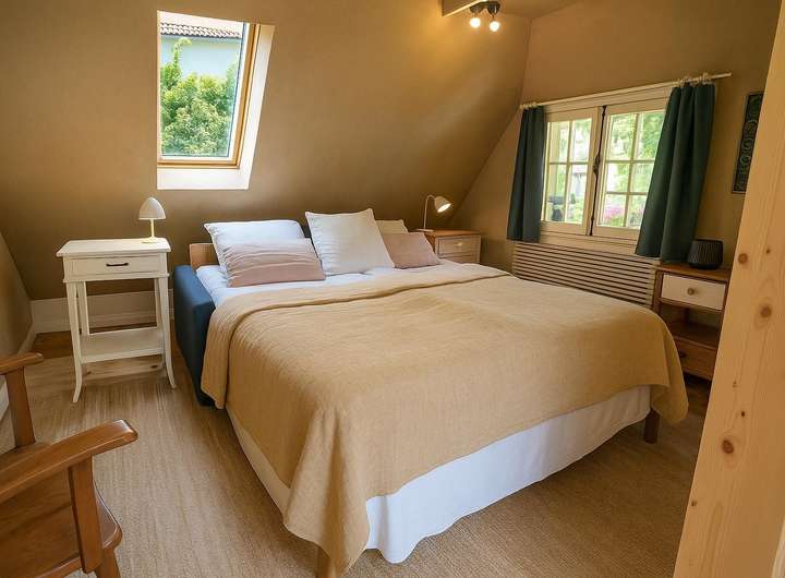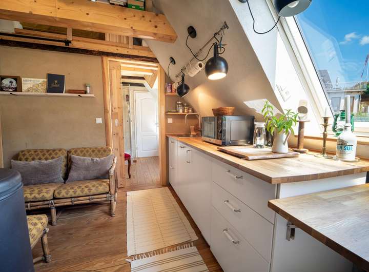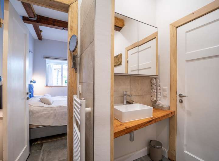 Ein ca. 30 m² großes Apartment in der oberen Etage ist ein echtes Raumwunder und wurde ebenfalls mit viel Liebe zum Detail gestaltet. Dabei wurde auch hier wieder darauf geachtet den charmanten Charakter der vergangenen Zeit mit einem modernen technischen und optischen Standard zu kombinieren, um höchsten Komfort zu bieten.