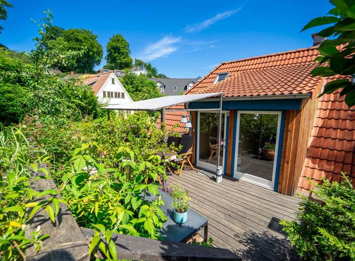 Am malerischen Elbhang von Blankenese, nur wenige Schritte von der ruhigen Anliegerstraße entfernt und stufenlos erreichbar, erwartet Sie ein einzigartiges Unikat: