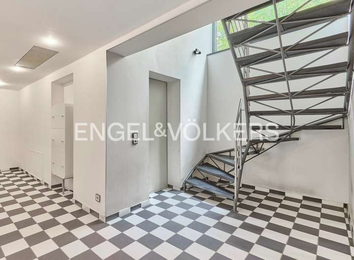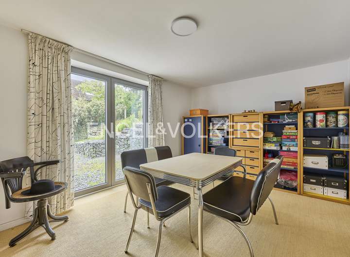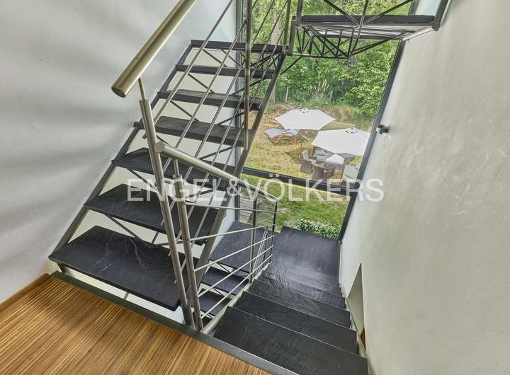 Die Hauptwohnung erstreckt sich über Erd-, Ober- und Dachgeschoss mit rund 288 m² Wohnfläche plus ca. 69 m² Nutzfläche. Im Erdgeschoss empfängt ein großzügiger Eingangsbereich. Rechterhand befinden sich Gäste-WC und Abstellkammer. Der elegante Treppenaufgang aus schwarzem Porto-Schiefer setzt einen besonderen Akzent. Ein ruhiges Büro ermöglicht konzentriertes Arbeiten. Das Herzstück bildet die offene Wohnküche mit Design-Küche, Kochinsel und einer maßgefertigten Nussbaum-Sitznische. Der angrenzende Wohnbereich mit Kaminofen öffnet sich über große Glasfronten zum Garten.
