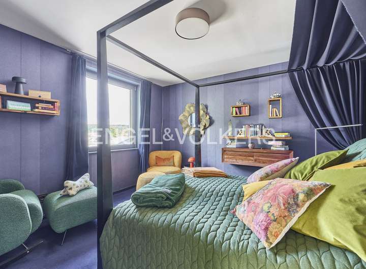 Das Dachgeschoss bietet weitere Nutzungsmöglichkeiten. Das große Zimmer wird aktuell als zweites Schlafzimmer genutzt. Eine südlich ausgerichtete, noch herzustellende Dachterrasse ermöglicht künftig einen Blick über das Mittelbachtal. Ein großes Bad sowie ein separates WC mit Bidet sind baulich vorbereitet. Ein weiteres Ankleidezimmer ist geplant und kann nach persönlichem Wunsch umgesetzt werden. Bodentiefe Fenster eröffnen einen herrlichen Blick ins angrenzende Waldgebiet.