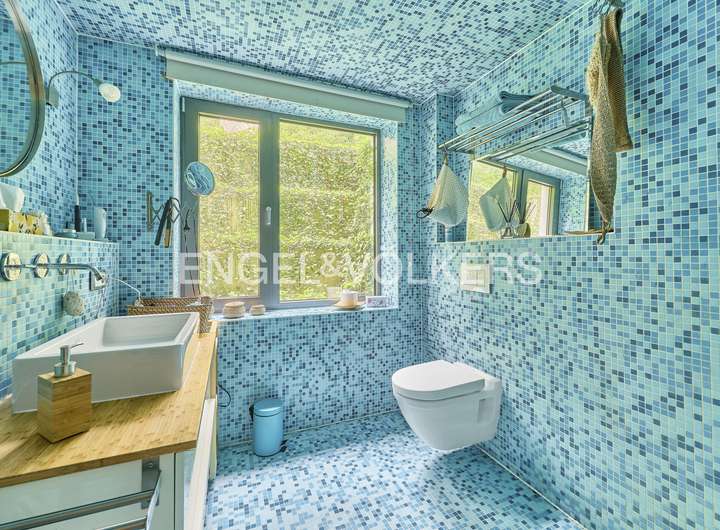 Das ausgebaute Souterrain mit ca. 86 m² Wohnfläche kann als eigene Wohneinheit genutzt und von der Hauptwohnung getrennt werden. Aktuell dient es als weitere Etage mit barrierefreiem Bad, zwei hellen Räumen mit Zugang zur Südterrasse, Heizungsraum, Wasch- und Trockenraum sowie einer vorbereiteten Küche, derzeit als Sauna genutzt. Zwei Stellplätze sind ebenfalls vorgesehen.