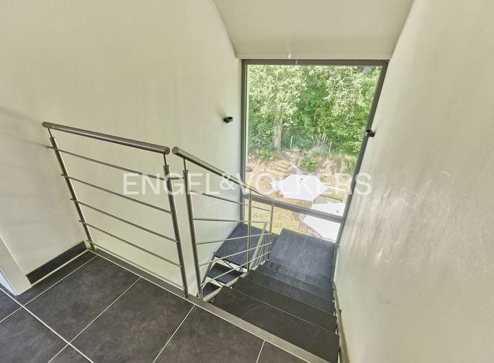 Im Obergeschoss setzen edle Materialien wie Nussbaumparkett den hochwertigen Stil fort. Das großzügige Tageslichtbad mit Panoramafenster befindet sich im Ausbau und erlaubt individuelle Gestaltung. Eine offene Galerie mit Leseecke bietet einen schönen Rückzugsort. Ein weiteres Zimmer dient als Ankleide, während das Schlafzimmer Ruhe ausstrahlt.