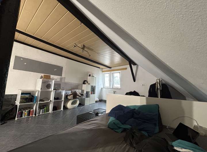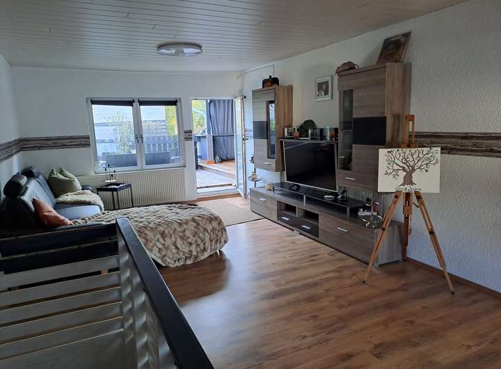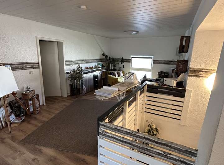 Eine seitlich gelegene Außentreppe führt vom Gartenbereich hinauf auf den ca. 30 m² großen Balkon, der direkt in das Wohnzimmer im Dachgeschoss übergeht. Alternativ ist diese Wohnebene auch bequem über eine innenliegende Treppe erreichbar, die das Erdgeschoss mit dem Ober- und Dachgeschoss verbindet. Der Wohnraum besticht durch seine ruhige, erhöhte Lage und bietet viel Platz für entspanntes Beisammensein.