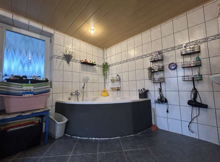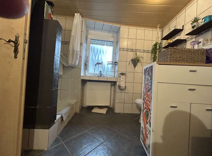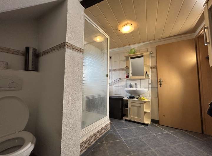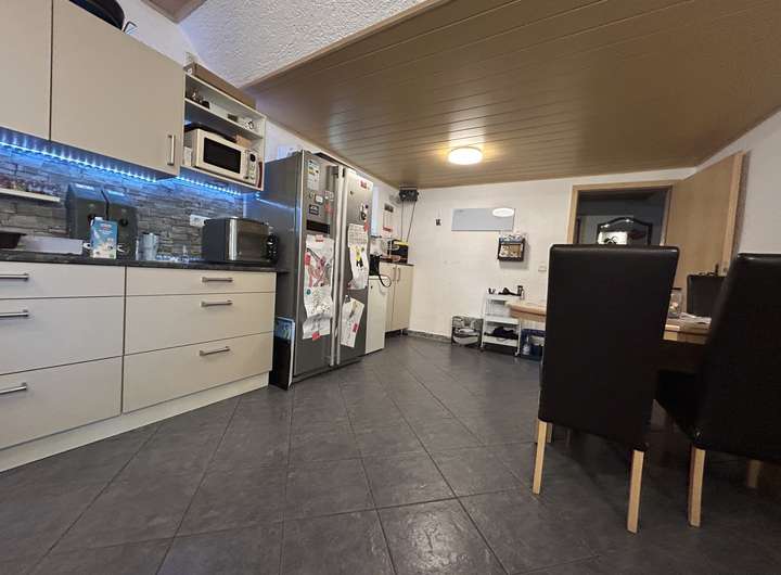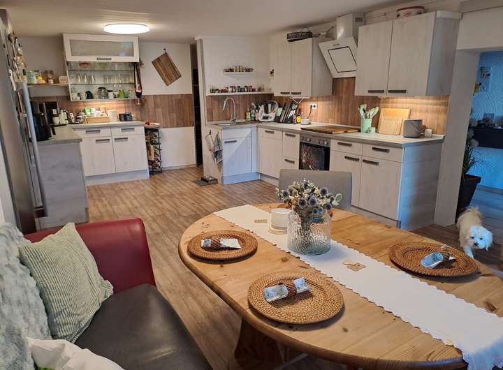 Folgt man dem Flur nach links entlang der längeren Seite, erreicht man geradeaus das Gäste-WC und links daneben ein voll ausgestattetes Badezimmer mit Dusche und Badewanne. Direkt davor liegt der Zugang zur großzügigen, offenen Wohnküche mit integriertem Essbereich und einem verstecktem Vorratsraum – ein heller und kommunikativer Raum, der das soziale Zentrum des Hauses bildet.