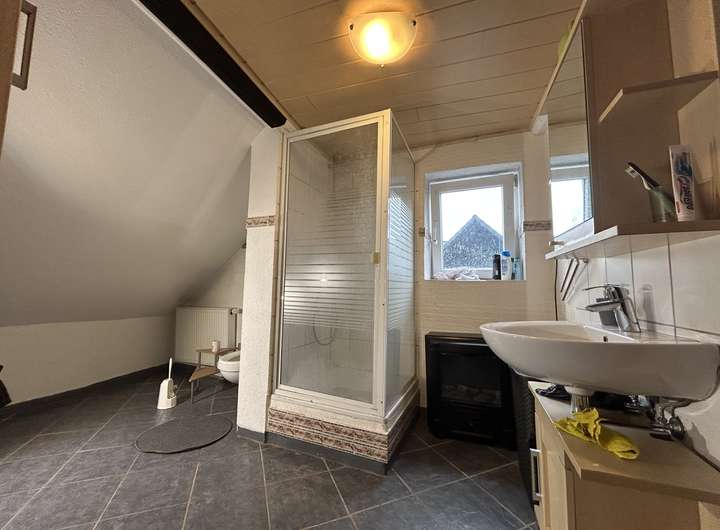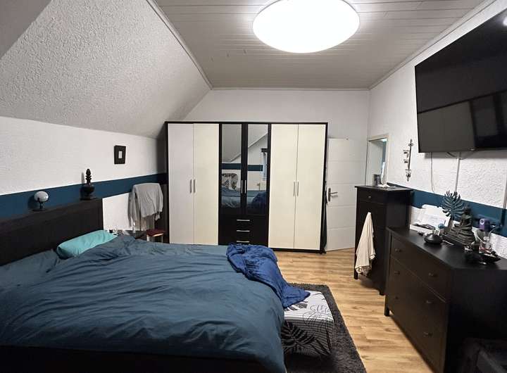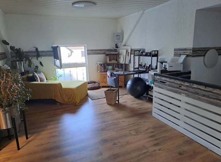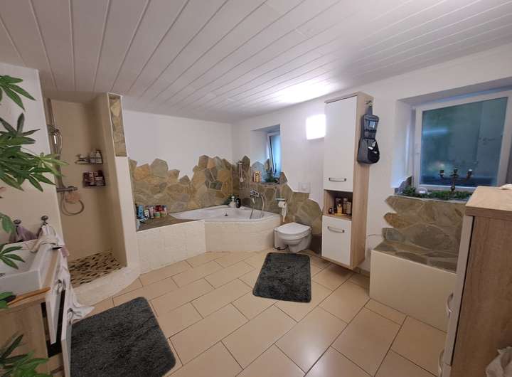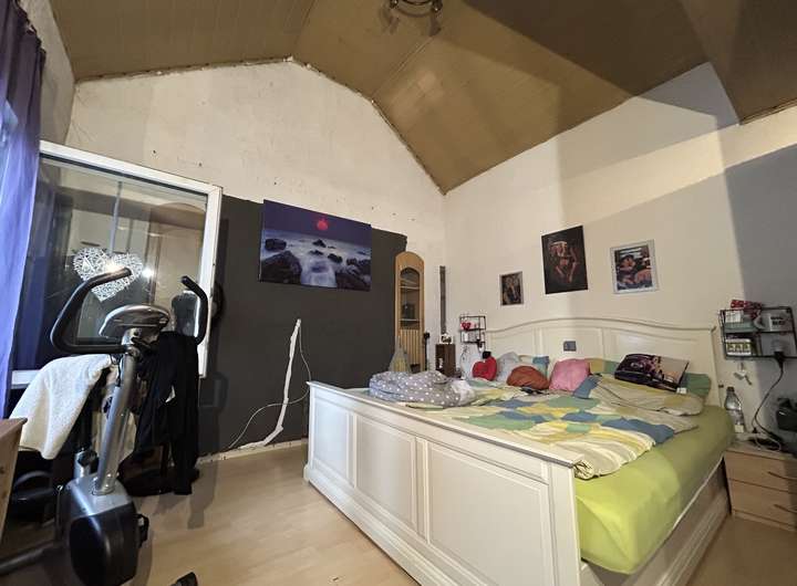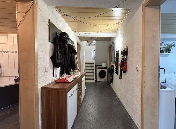 Die vermietete Einheit befindet sich in direkter baulicher Verbindung mit dem Haupthaus, ist jedoch vollständig separat zugänglich. Beim Betreten gelangt man in einen Flur, von dem aus man zunächst in ein Schlafzimmer sowie in ein separates Badezimmer kommt, beide gut geschnitten und hell. Eine sehr große Wohnküche mit Zugang zum Außenbereich, ein großer Abstellraum ergänzen diesen Bereich. Über eine innenliegende Treppe erreicht man den oberen Wohnbereich, wo sich ein weiterer Flur mit mehreren Räumen anschließt: Ein großes Wohnzimmer, ein Ankleidezimmer sowie drei zusätzliche Schlafzimmer. Ganz oben im Dachgeschoss befindet sich ein weiteres Schlafzimmer, sowie ein modernes Badezimmer, ein Büro und ein weiterer Abstellraum. Die Aufteilung ist offen und dennoch klar strukturiert, sodass sich die Wohnbereiche gut voneinander trennen lassen. Die auf dem Dach installierte Solaranlage sorgt für eine umweltfreundliche Energiegewinnung und trägt zur Senkung der Betriebskosten bei. Trotz baulicher Verbindung zum Haupthaus fühlt sich die Einheit vollständig eigenständig an, mit eigener Privatsphäre und eigenem Außenbereich, ergänzt durch die gemeinschaftlich genutzte Heizungsanlage.