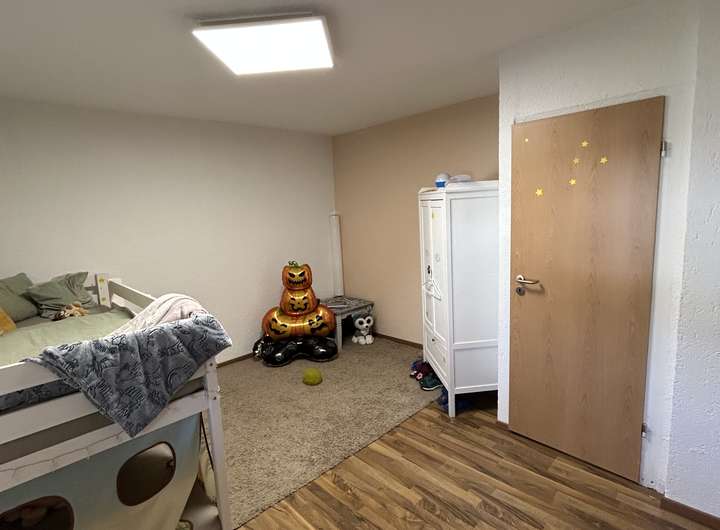 Ebenfalls auf dieser Ebene befindet sich ein weiteres Schlafzimmer. Drei Stufen tiefer – leicht versetzt, aber offen angebunden – liegen zwei zusätzliche Zimmer, ideal nutzbar als Kinderzimmer, Gästezimmer oder Homeoffice. Diese Staffelung sorgt für eine klare Zonierung, ohne die offene Atmosphäre zu stören.