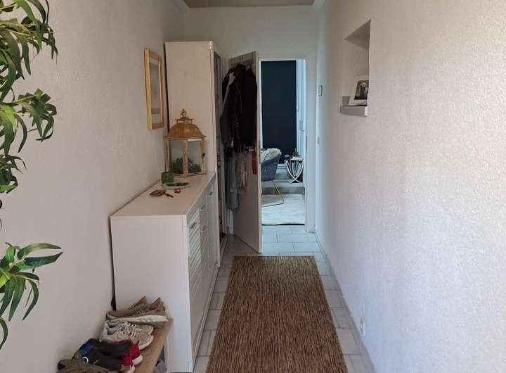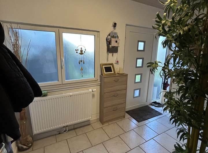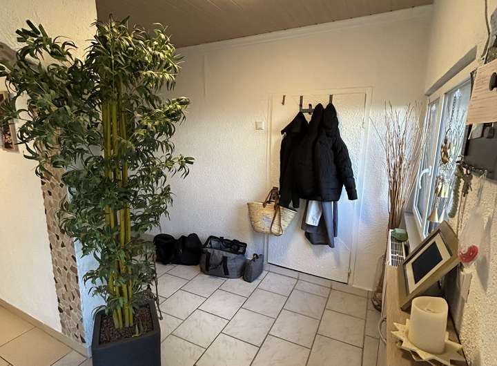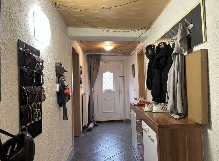 Man betritt das Haus über einen kleinen Windfang, der in einen zentralen Flur führt, der sich U-förmig – jedoch ohne Rundung – durch das Haus zieht. Zur Rechten gelangt man über die kurze Seite des Flurs zum Abstellraum sowie in das ruhig gelegene Schlafzimmer mit Blick zum Garten – ideal als Elternschlafzimmer oder privater Rückzugsort. Von hier besteht auch ein direkter Zugang zur überdachten Terrasse.