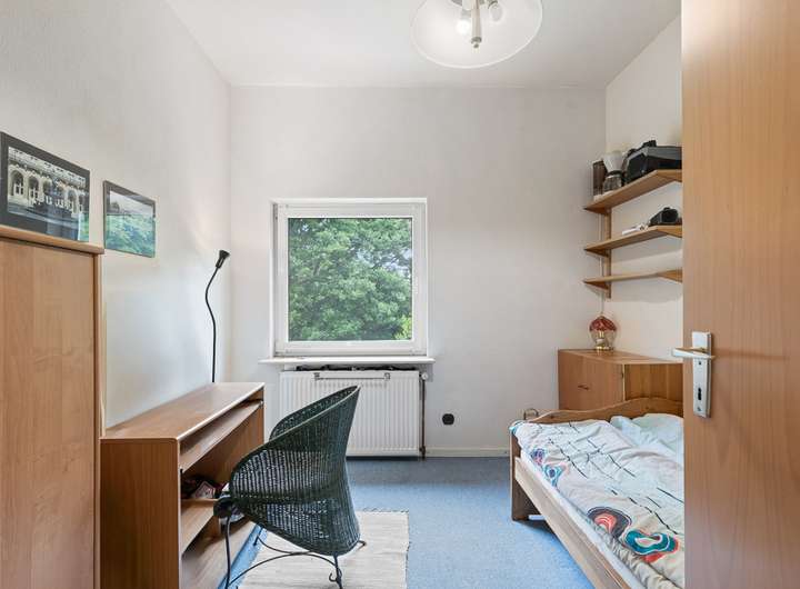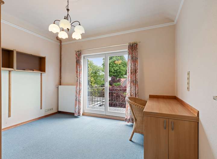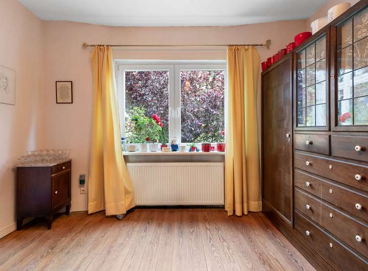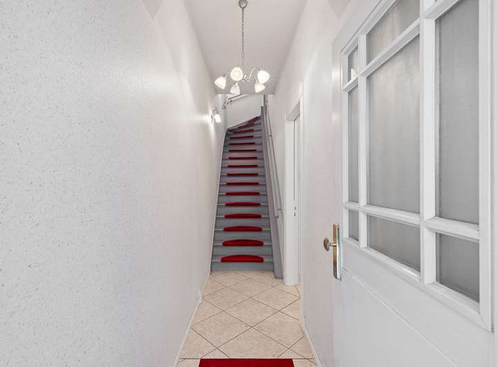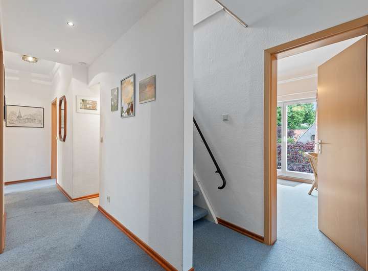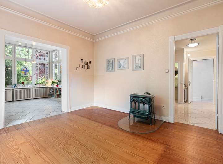 Beim Betreten des Hauses empfängt Sie ein funktionaler Eingangsbereich, der im Erdgeschoss in einen großzügigen Flur übergeht. Die Räume sind durch hohe Decken und große Fenster geprägt, die für ein helles und freundliches Ambiente sorgen. Der Wohnbereich bietet viel Platz für gesellige Abende und führt direkt in den Erker mit Blick in den Vorgarten.