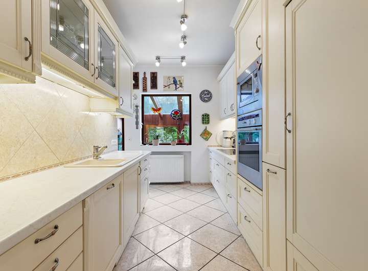 Die Küche ist funktional im Landhausstil gestaltet und mit modernen Geräten ausgestattet, die das Kochen zum Vergnügen machen mit einen direkten Zugang zum Wintergarten, der einen wunderbaren Blick in den gepflegten Garten eröffnet.