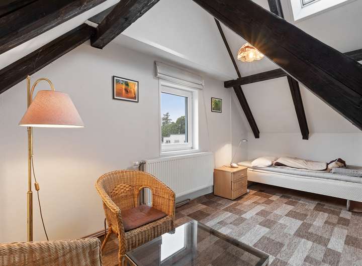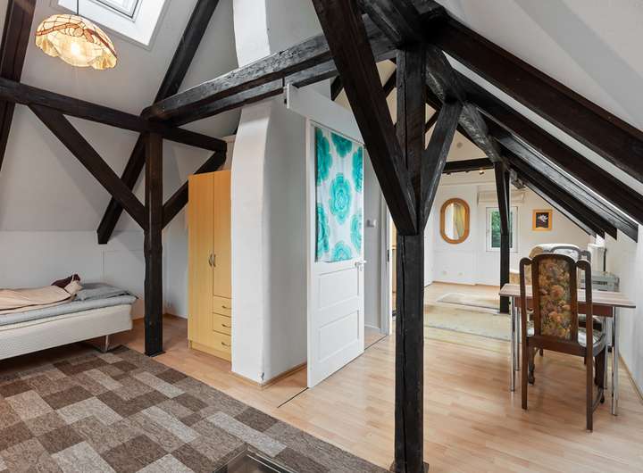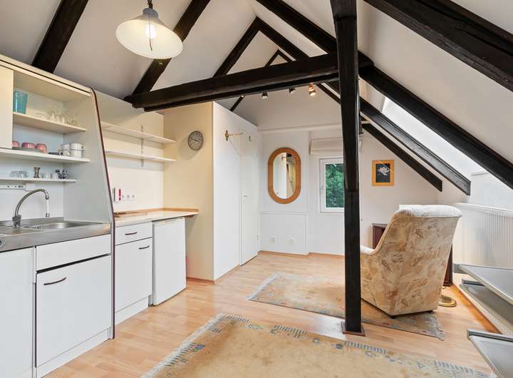 Das Dachgeschoss bietet mit einer Kochnische und WC ein kleines eigenes Reich mit rustikalen Balkenansicht.