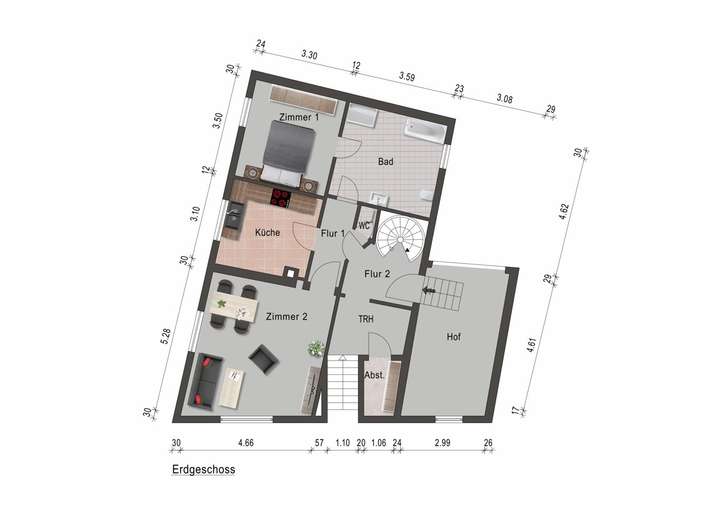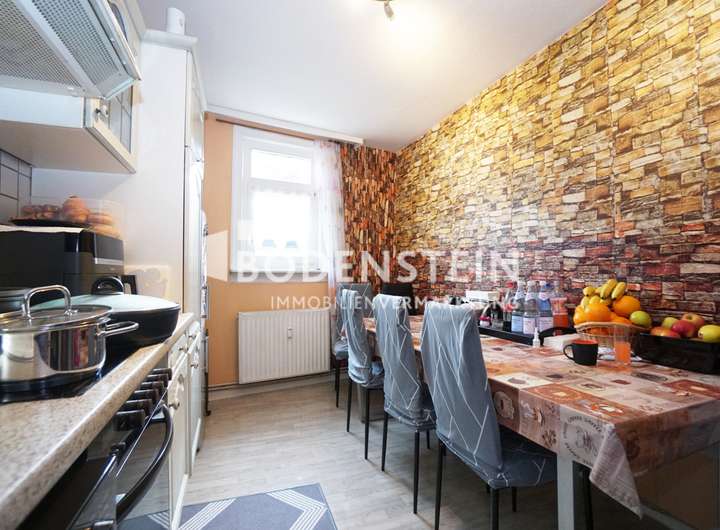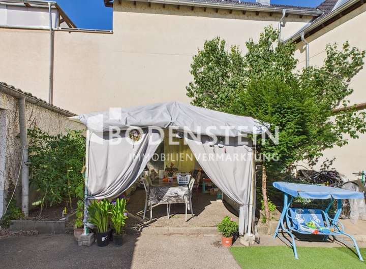 Zwei helle Zimmer, Küche und Bad bieten auf ca. 72 m² eine charmante Einheit, ideal für Einzelpersonen oder Paare. Die Raumaufteilung ist großzügig und eröffnet kreative Möglichkeiten für moderne Wohnkonzepte im historischen Rahmen. Ein kleiner Gartenbereich sorgt für zusätzliche Aufenthaltsqualität.