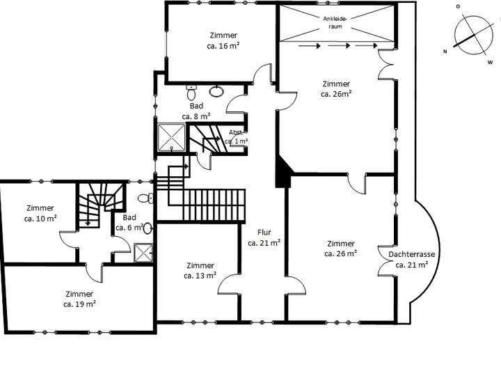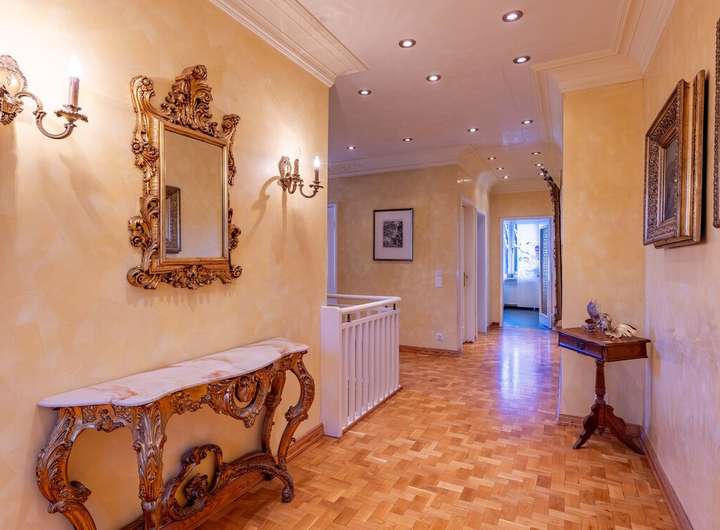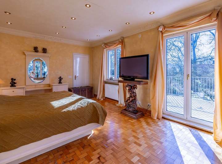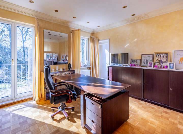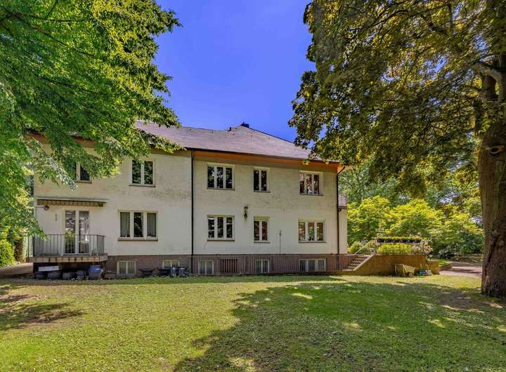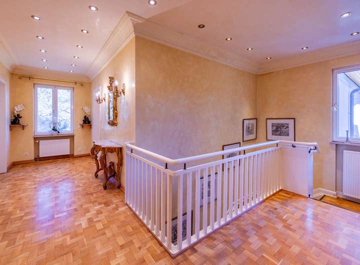Im Obergeschoss stehen vier Schlafzimmer und ein großes Bad zur Verfügung. Eine Einliegerwohnung mit separatem Eingang erweitert das Raumangebot, ist jedoch sanierungsbedürftig. Insgesamt bietet die Villa ca. 365 m² Wohnfläche; ein großer Spitzboden (ca. 98 m² Nutzfläche) bietet weiteren Stauraum.