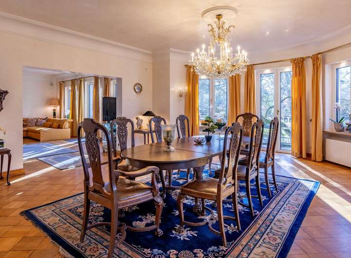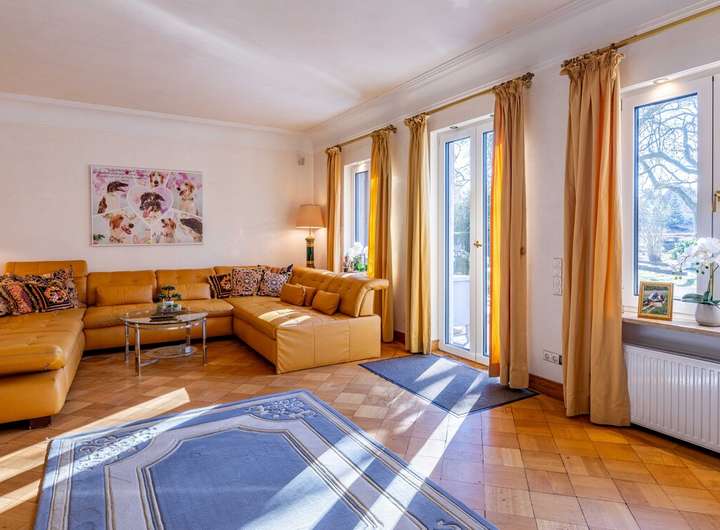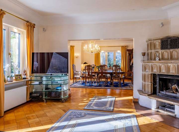 Im Inneren verbindet die Villa großzügige Räume mit historischem Charme und modernen Akzenten. Das Entrée führt in den Wohn- und Essbereich mit Blick ins Grüne und Zugang zur großen Terrasse. Hochwertige venezianische Spachteltechnik verleiht den Wänden eine edle Anmutung, ein Kamin sorgt für wohltuende Atmosphäre. Zwei weitere Zimmer, ein Bad und ein Gäste-WC vervollständigen das Erdgeschoss.