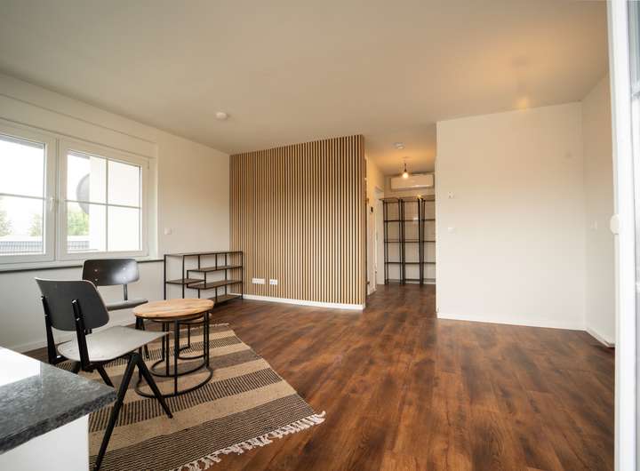 Im Obergeschoss erwartet Sie ein lichtdurchfluteter Wohn- und Essbereich mit offener Küche – der zentrale Ort für gemeinsame Stunden, für Gespräche bei einem Glas Wein oder einfach für den stillen Blick ins Grüne. Stilvolle Akustikpaneele schaffen nicht nur ein modernes Design, sondern auch eine angenehme Klangkulisse, die den Raum in eine ruhige Wohlfühlzone verwandelt.