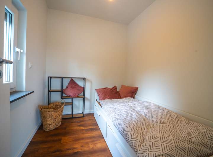 Zwei helle Schlafzimmer und ein elegant gefliestes Tageslichtbad mit bodentiefer Dusche vervollständigen das obere Geschoss. Die hochwertige Marmortreppe mit Edelstahlhandlauf führt stilvoll hinunter in das Erdgeschoss – dort finden Sie ein weiteres Badezimmer und ein separates Ein-Zimmer-Apartment, das sich ideal für Gäste, kreative Auszeiten oder als Arbeitsbereich anbietet.