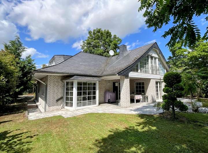 Freistehendes Einfamilienhaus mit ansprechender Architektur, 1990 massiv erbaut mit weißer Klinkerfassade, ausgebautem Satteldach (2014 renoviert), mit Schiefer- und Schwalbenschwanzgauben, Kunststoff-ISO-Fenstern mit Sprossen, Gaszentralheizung (neu 2019), mit Fußbodenheizung, Kamin, Einbauküche, zwei Bädern, großer Terrasse, zwei Balkonen, großer Garage und einem Gartenhaus in einem schön angelegten Garten in ruhiger Lage.