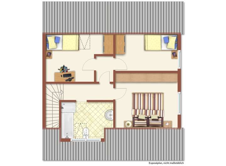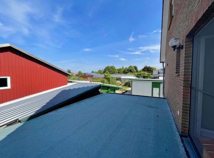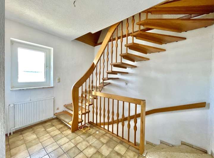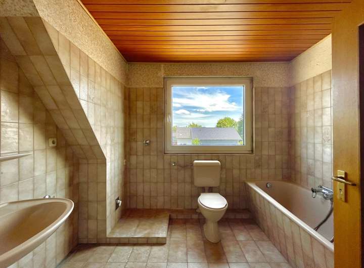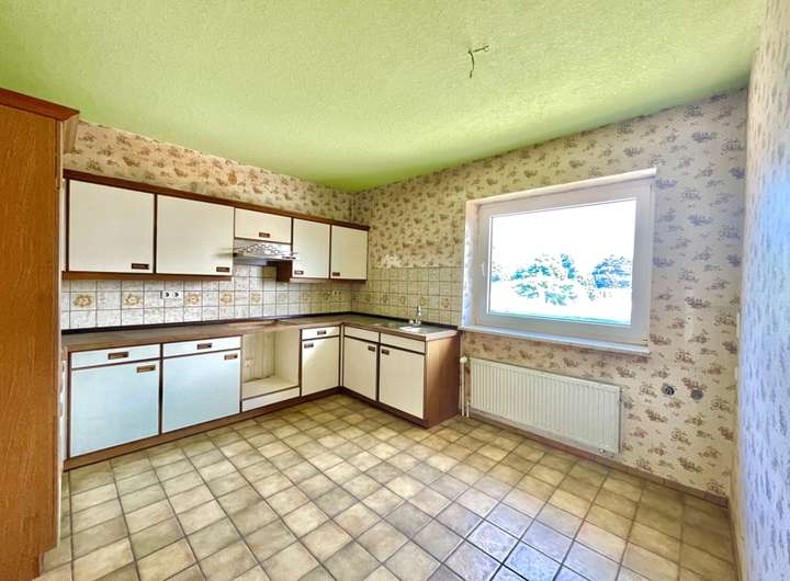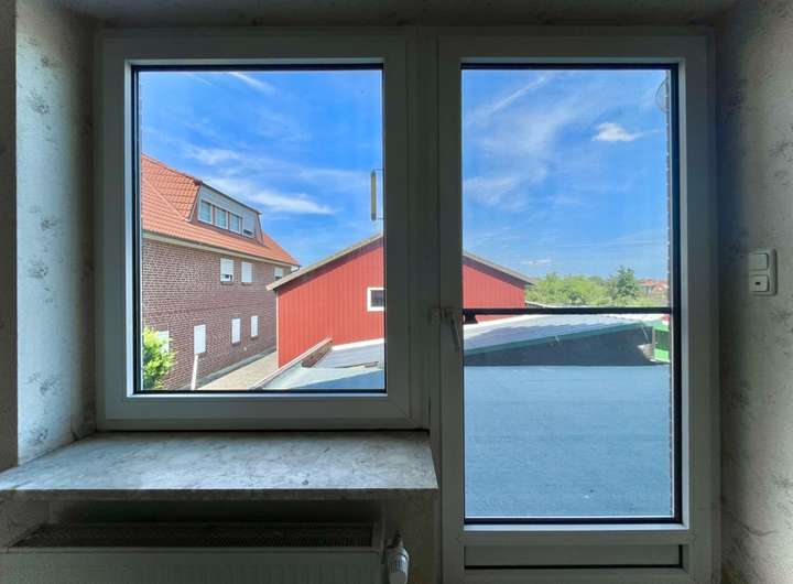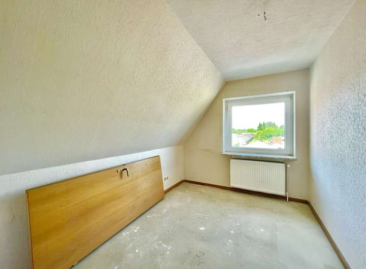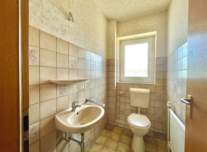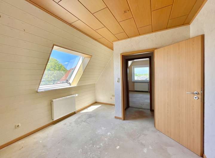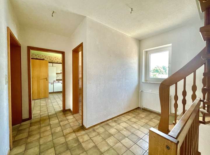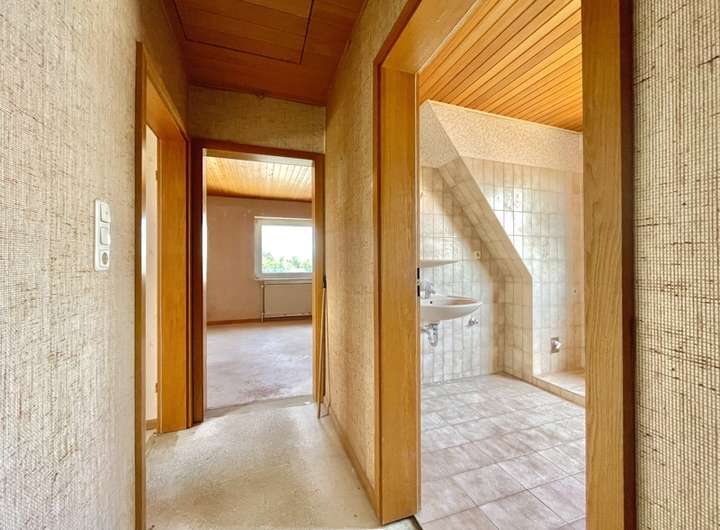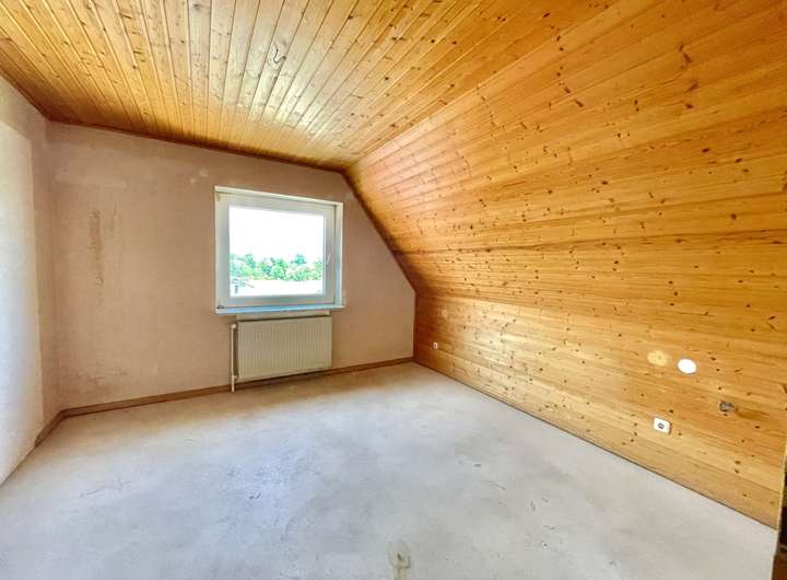 Ein separater Eingang führt über eine Betontreppe in das Obergeschoss. Dort erwarten Sie eine geschlossene Küche mit angrenzender Speisekammer, ein Gäste-WC sowie das großzügige Wohnzimmer. Die Fensterfront des Wohnzimmers grenzt direkt an dem Dach des Anbaus - schauen Sie sich gerne die Fotos zur Verdeutlichung an. Im Dachgeschoss befinden sich drei weitere Zimmer sowie ein praktisches Voll- und Duschbad. Darüber hinaus steht Ihnen ein Spitzboden (Kaltdach) als zusätzliche Abstellfläche zur Verfügung.