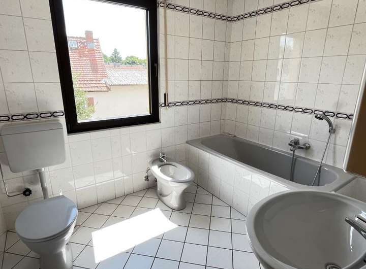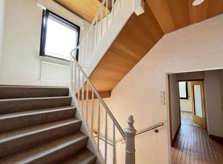 Das 1. Obergeschoss verfügt ebenfalls über 3 Zimmer, Küche und Bad und über einen größeren Balkon mit Blick in den weitläufigen Garten.