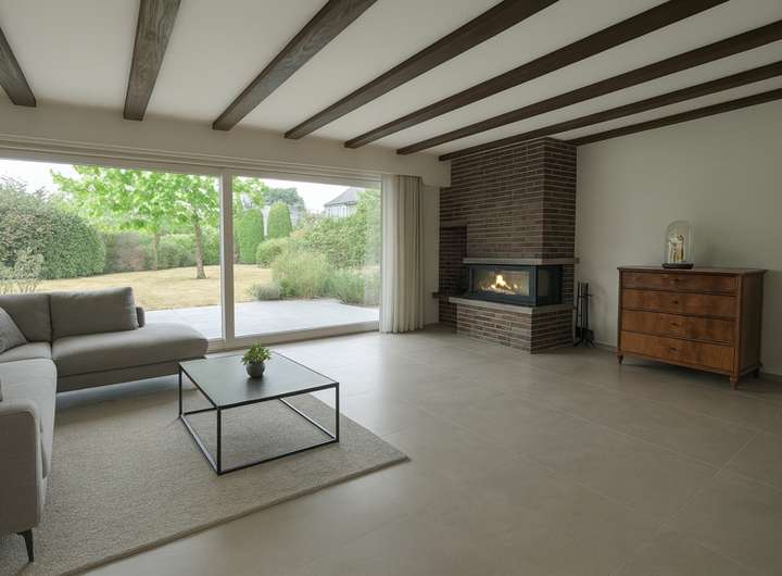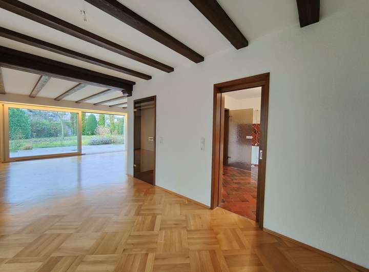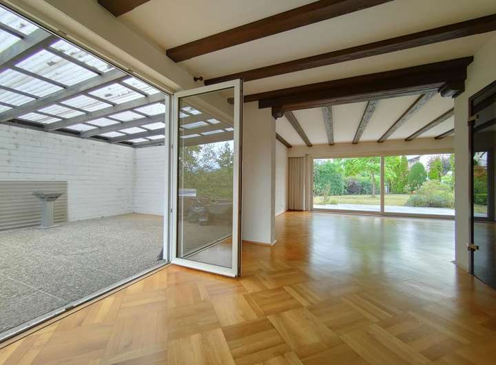 Großzügiger, heller Wohnbereich mit Kamin, Glas-Schiebetüren und direktem Zugang zur Terrasse und in dem großzügigen Garten. Ein offen gestalteter Essbereich mit Zugang zur überdachten und geschützten seitlichen Terrasse, 1 separate Küche, 1 Zimmer mit eigenem Terrassenzugang – ideal als Büro, Gästezimmer oder weiteres Schlafzimmer, 1 Gäste-WC und eine Abstellkammer.