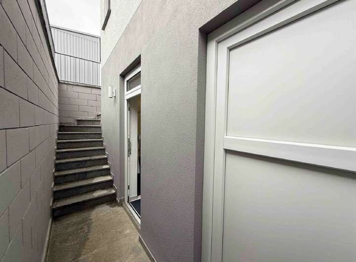 komplette, elegante und pflegeleichte Natursteintreppe mit Edelstahlhandlauf