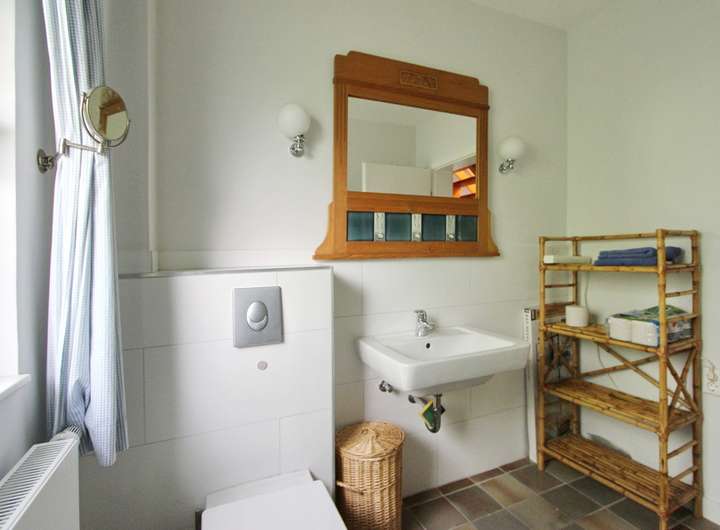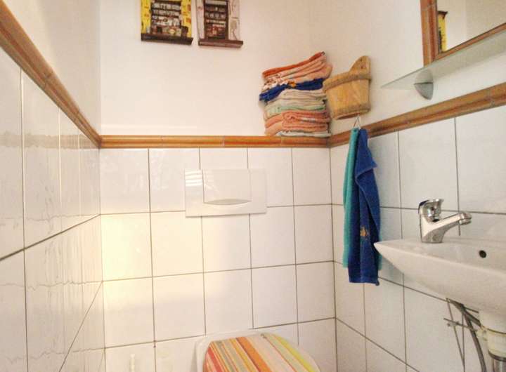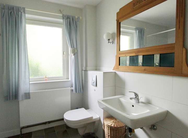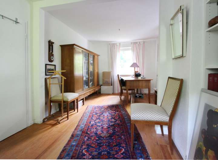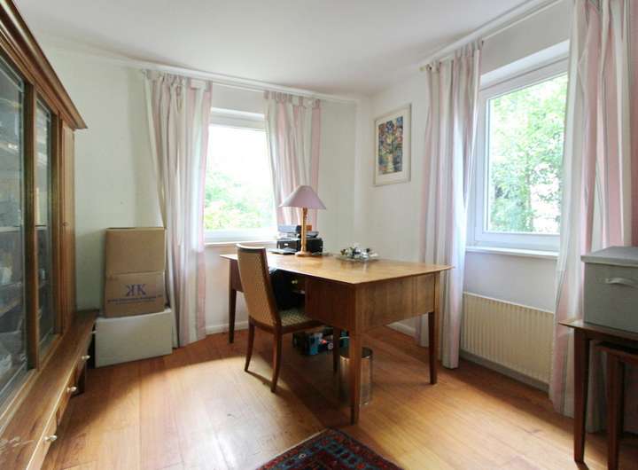 Ein weiteres Zimmer im Erdgeschoss eignet sich z. B. als Gäste- oder Arbeitszimmer. Ebenfalls im Erdgeschoss: ein modernisiertes Duschbad mit ebenerdiger Dusche sowie ein Gäste-WC. Zwei Terrassen sind direkt zugänglich.