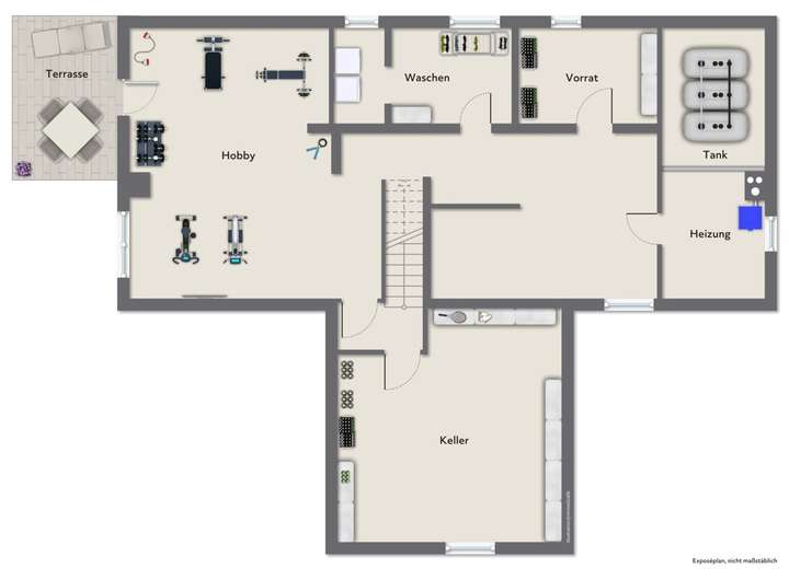 Der Vollkeller bietet großzügige Nutzfläche; ein wohnlich ausgebauter Raum hat sogar direkten Zugang zur dritten Terrasse.