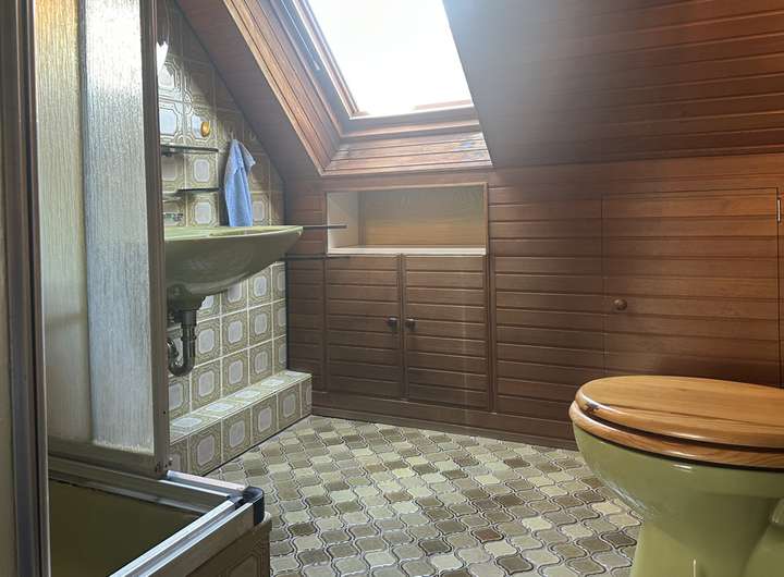 Das großzügige Badezimmer im Erdgeschoss sowie das Duschbad im Dachgeschoss stammen noch aus dem Baujahr des Hauses. In beiden Bädern sorgen jeweils ein Fenster für eine gute Be- und Entlüftung.