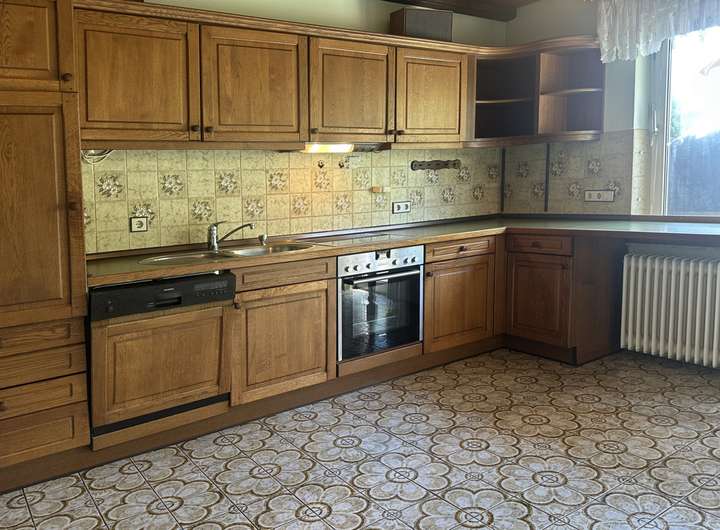 In der großzügigen Küche befindet sich eine ältere Einbauzeile mit allen erforderlichen Gerätschaften. Die Fenster sind in Kunststoff gefasst und isolierverglast. Die Beheizung erfolgt über eine ältere Ölzentralheizung.