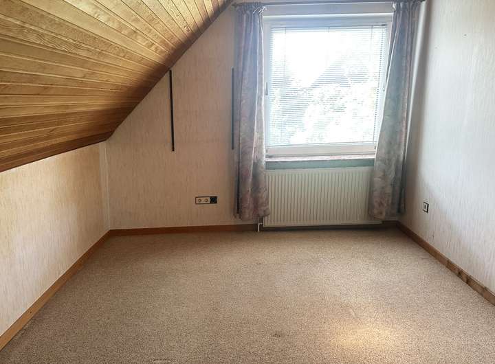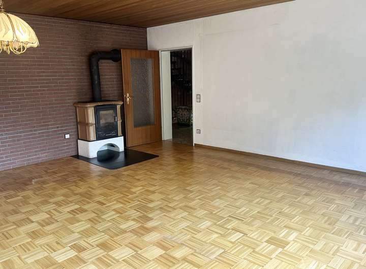 In den Zimmern im Erdgeschoss ist Parkettboden verlegt, im Dachgeschoss ist Auslegware vorhanden. Der Windfang, der Flur und die Küche sind gefliest.