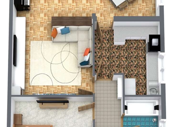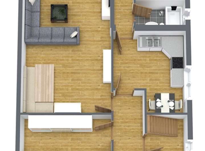 - Erdgeschoss: Wohn- und Essbereich, Küche, Badezimmer, Schlafzimmer, Balkon