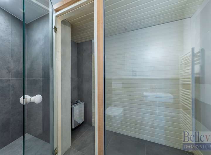 Über die Stahltreppe gelangen Sie ins 1. Obergeschoss. Dort befinden sich 3 Schlafzimmer, 2 Bäder, 1 davon mit Sauna.